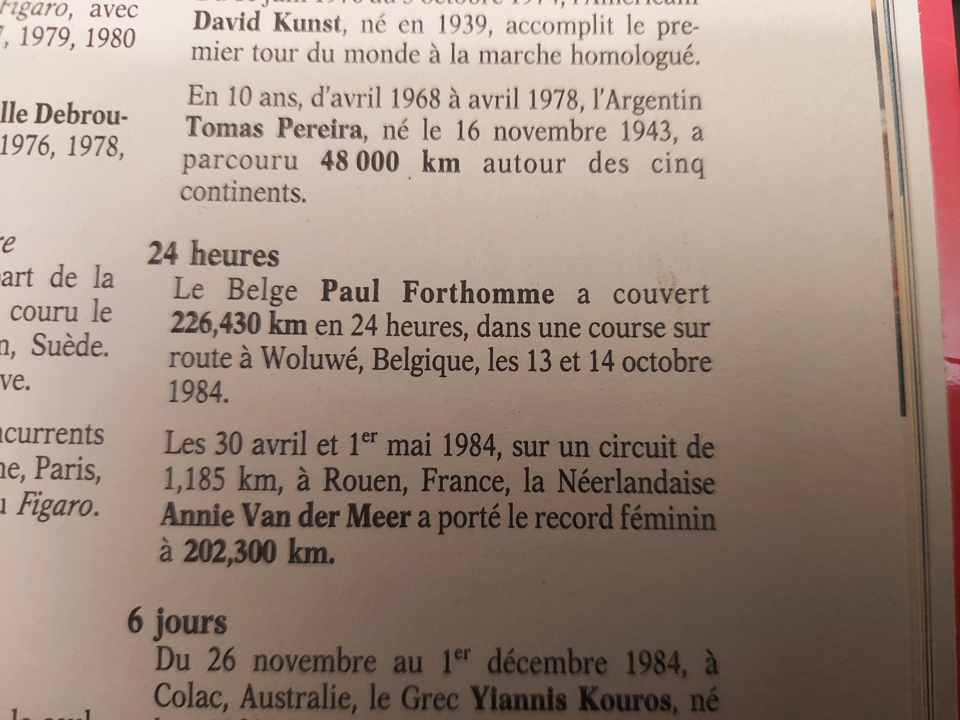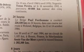Depuis 1984, un Belge, le Visétois Pol Forthomme, est détenteur d’une meilleure performance mondiale, qui plus est établie chez nous (Woluwé-Saint-Lambert). C’est moins médiatique, non reconnu par l’IAAF, mais il n’empêche que ses 226,432 km sur 24 heures en marche athlétique tiennent depuis le 14 octobre 1984 en haut des tablettes.